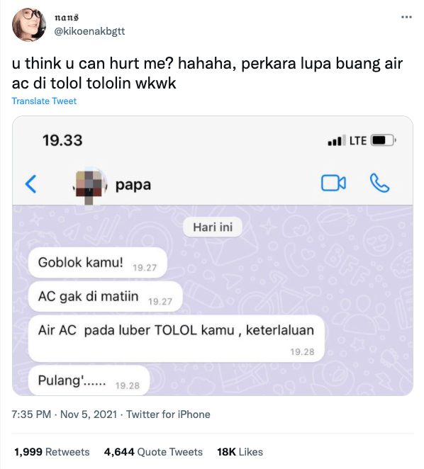 Beberapa hari lalu, saya menanggapi sebuah tweet viral di Twitter tentang seorang anak yang curhat karena dia habis dikata-katain “tolol” oleh ayahnya. Hati saya ikut bergetar. Sebagai orang tua sekaligus anak, saya sedih sekali melihat huruf capslock “tolol” yang dikirim oleh seorang ayah untuk anak perempuannya. Tidak ada hal lain yang menerpa anak itu selain luka. Walaupun ia mengatakan bahwa ia berusaha kuat, saya yakin hatinya teriris.